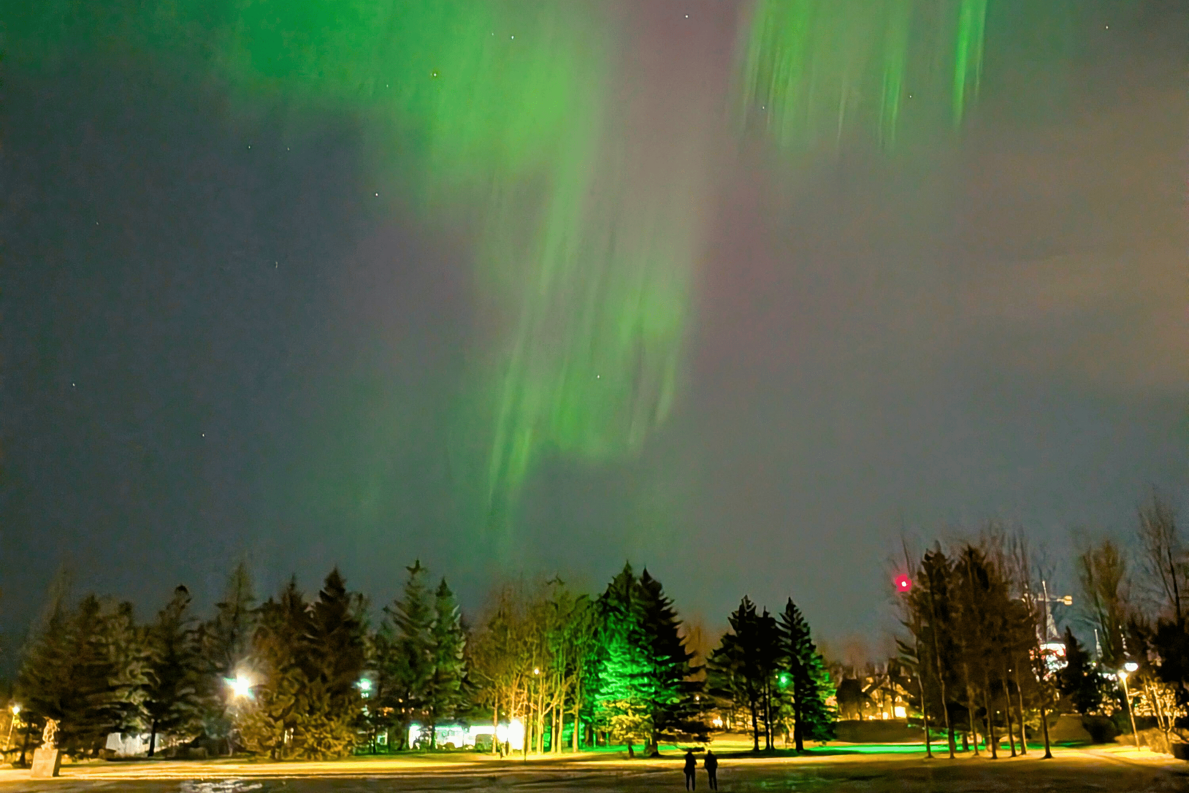 Un sentier traverse le parc et, bien qu'il soit assez bien éclairé, on peut encore admirer les rubans verts et roses scintillants qui dansent dans le ciel. Pour une obscurité encore plus totale, il suffit de quitter le sentier et de s'aventurer dans la vaste pelouse.