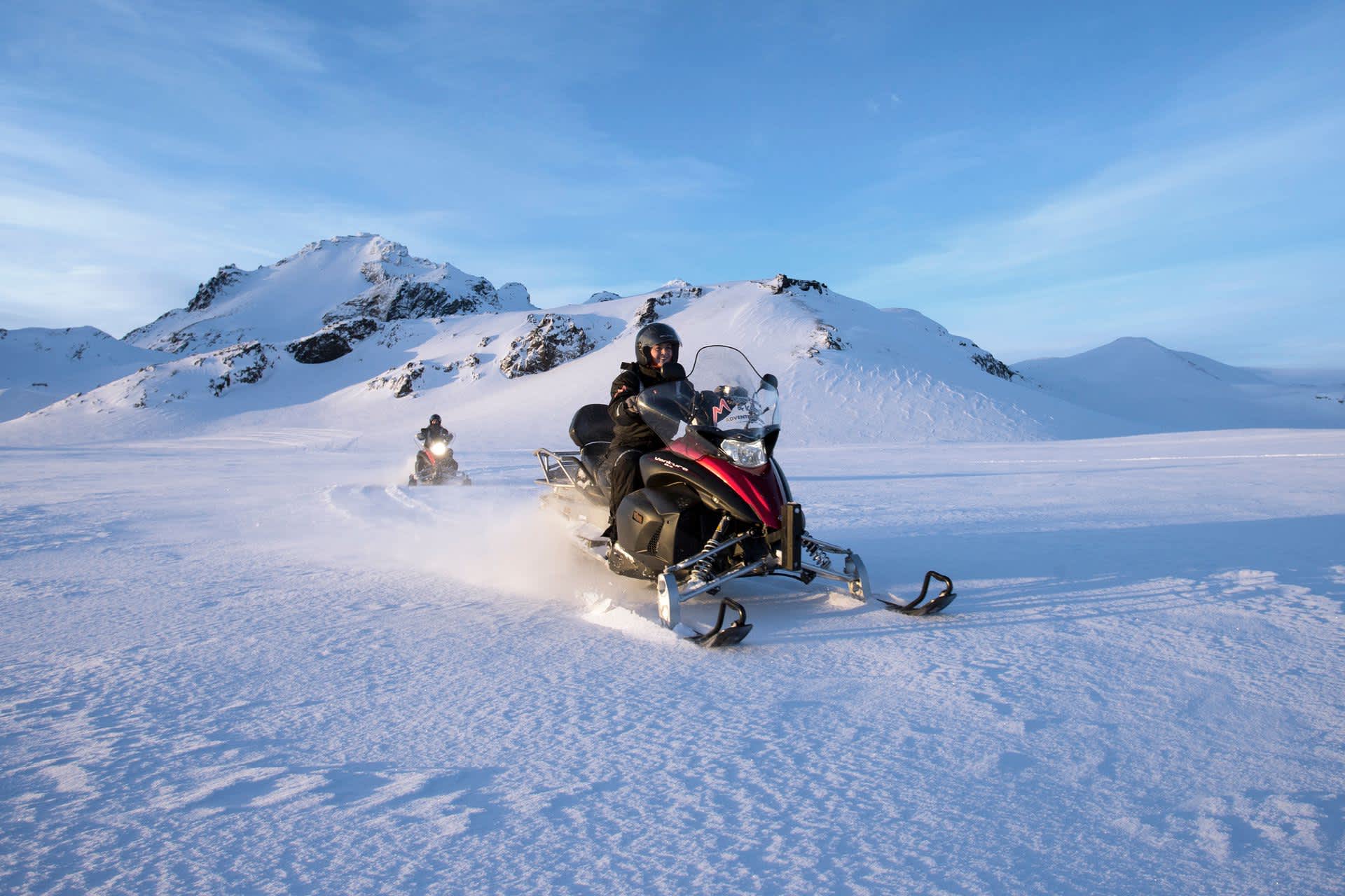 Après avoir traversé la région des Highlands pour atteindre le glacier, vous atteindrez le camp de base où vous recevrez tout l'équipement de sécurité et vous apprendrez à conduire la motoneige. Ensuite, il ne reste plus qu'à traverser les plaines blanches du glacier Langjökull pendant que l'adrénaline monte dans vos veines. Après un voyage amusant sur le glacier, vous retournerez à la super jeep qui vous ramènera à Reykjavik.