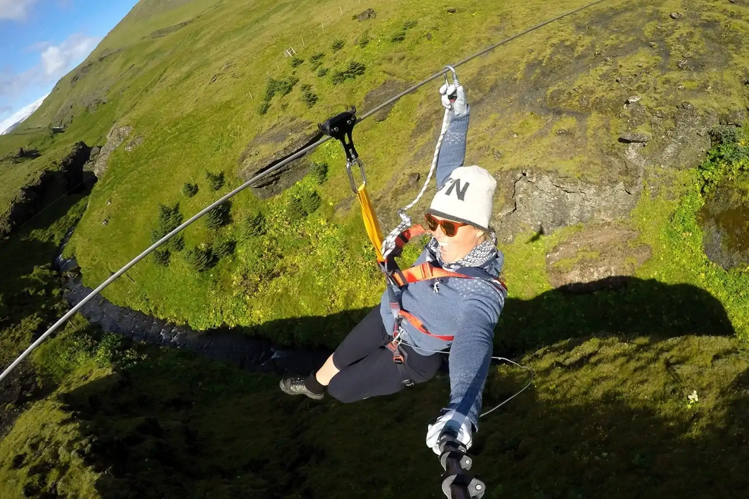Discover the hidden gems found just outside of Vík Village while simultaneously feeling your adrenaline pumping on a Zipline Tour. You’ll get a new perspective on Iceland’s beautiful nature by seeing it from above, with the wind blowing in your hair and your feet dangling in the air. In total, you’ll zip down four lines, flying over meadows, canyons, and waterfalls.